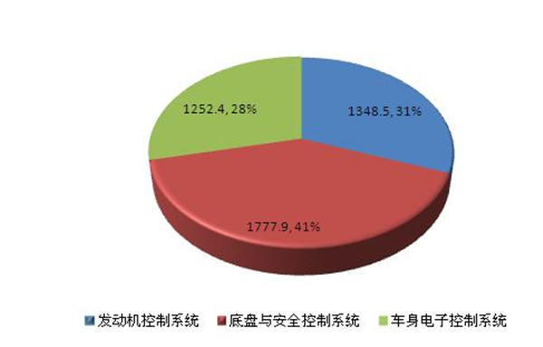 据统计,我国汽车电子市场中,动力控制系统市场份额最大,占到28%;其次是底盘与安全控制系统,占到27%;车身电子市场份额占23%,市场份额最低的是车载电子,为22%(见图3)。